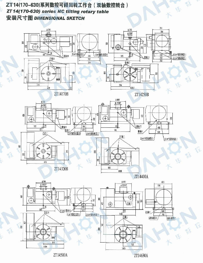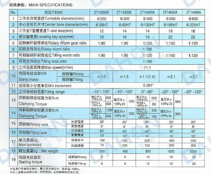 ZT 14 NC rotary table is constructed complete with an NC controllable rotary axis as well as an NC controllabletilting axis,and mainly used with CNC milling machine and machine center,It is controlled either by two-coordinatecontrol system of the main machine or by selfequipped two-coordinate control system.In combination with mainmachine,holes,slots,cam,curving line and surface in any angle position can be carried out precisely.Besides,it can alsobe used in common drilling,milling and boring machines,performing independently equal and unequal divisions.